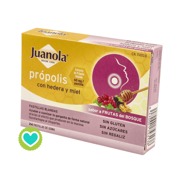 Pastillas para chupar que contienen própolis, hiedra y miel para calmar la irritación de garganta. Sabor a frutas del bosque.Juanola Própolis Hedera Sabor Frutas del Bosque 24 pastillas son unos caramelos de goma que suavizan la garganta y mejoran la respuesta inmunitaria gracias a que están compuestas de propóleo, rico en diferentes vitaminas, así como de extracto de hiedra y de miel. Estos componentes con hidratan la garganta, aliviando la irritación. Aporta bienestar al aparato respiratorio y especialmente a las vías altas.