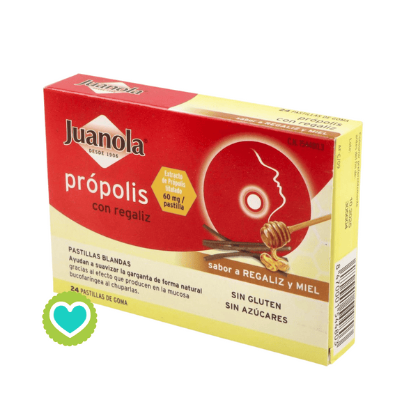 Pastillas blandas para chupar con sabor a regaliz y miel que contiene extracto de propólis para suavizar la garganta irritada o seca.Juanola Própolis Sabor Regaliz y Miel 24 pastillas son unos caramelos que contienen extractos naturales de regaliz y miel con própolis para suavizar la garganta cuando está seca o irritada. El própolis le aporta una composición beneficiosa de flavonoides, aceites esenciales y diferentes vitaminas que mejoran la barrera defensiva de esta zona del cuerpo y se unen al regaliz que despeja las vías respiratorias.