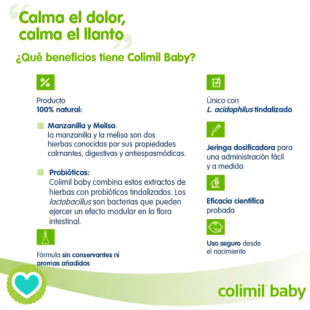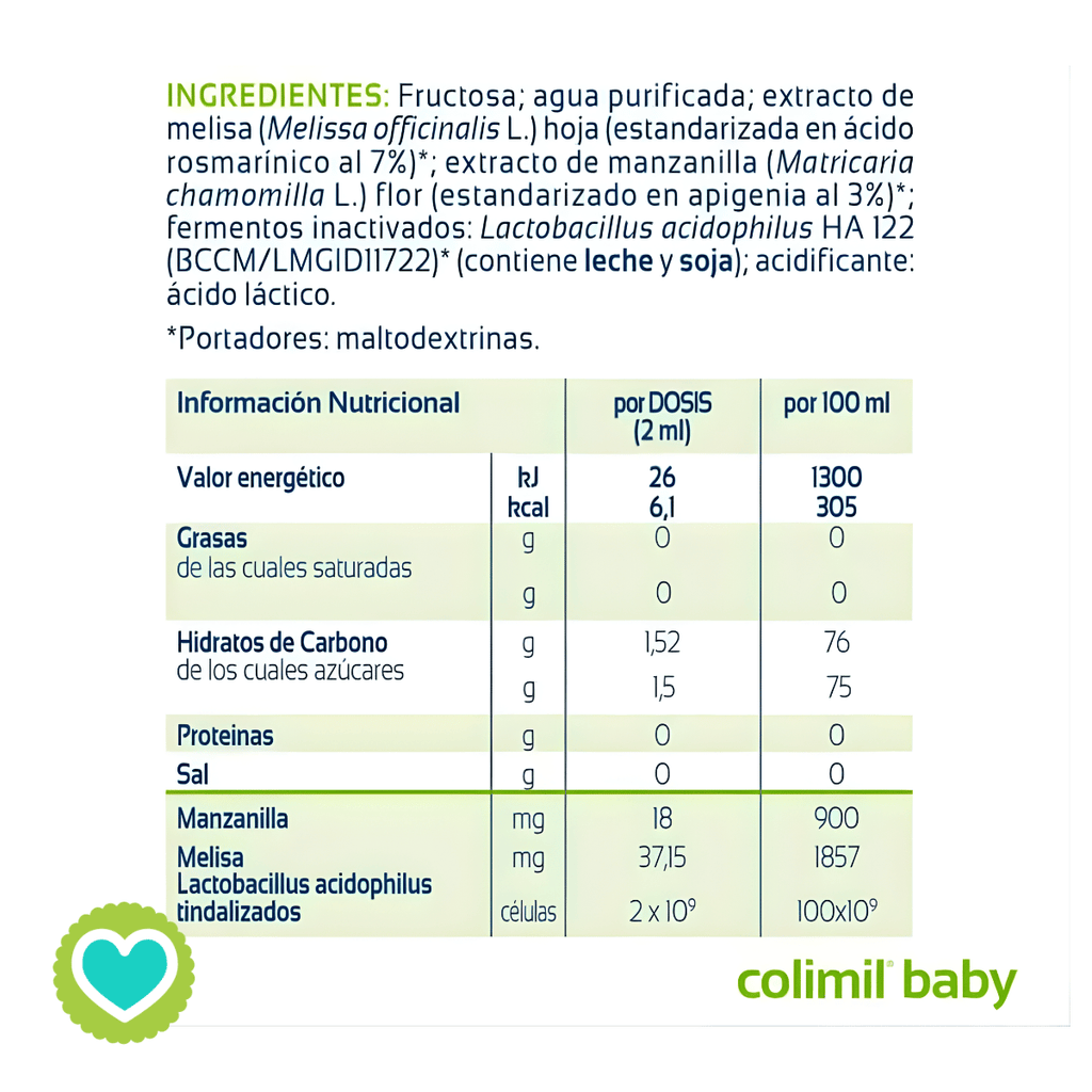 Complemento alimenticio que alivia las molestias del cólico del lactante. Puede contener trazas de leche, soja y derivados.El cólico del lactante es un síndrome cuyo origen sigue sin haber sido definido con claridad. Humana Colimil Baby Frasco 30ml es un complemento elaborado precisamente para paliar el conjunto de síntomas que componen este síndrome y aliviar las molestias que sufre el bebé. Su fórmula a base de manzanilla, melisa y Lactobacillus acidophilus favorece la digestión, reduce la formación de gases y permite el correcto desarrollo de la flora intestinal. La próxima vez que tu bebé muestre síntomas de padecer el cólico del lactante, no dudes en administrar Humana Colimil Baby Frasco 30ml.