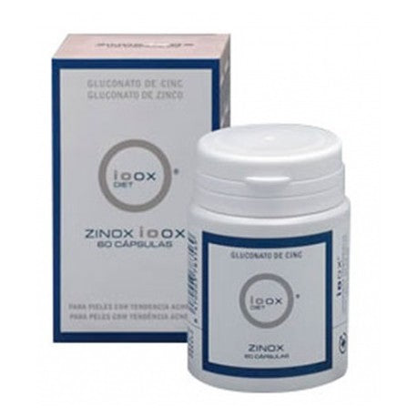 Complemento alimenticio a base de Gluconato de Cinc, Vitaminas A, E y B6, para el mantenimiento de la piel en condiciones normales. Ayuda al normal funcionamiento del sistema inmunitario.Zinox IOOX 60 Cápsulas es un complemento alimenticio que incorpora de forma equilibrada los nutrientes necesarios para prevención y tratamiento de las pieles grasas y/o tendencia acnéica. Su fórmula con gluconato de zinc, beta caroteno (vitamina A), vitamina E y vitamina B6 resulta ideal como coadyuvante en el tratamiento del acné.