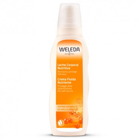 Esta leche corporal contiene extracto de Espino Amarillo, el cual ofrece un cuidado especial a las pieles más secas y agredidas.Weleda Leche Corporal Espino Amarillo 200 ml es un producto de nutricosmética indicado para recuperar la salud de la piel y mantener su nivel de hidratación, especialmente, para aquellas más secas y castigadas. El hecho de contener Espino Amarillo, hace que esta leche corporal sea rica en vitaminas, carotenos y ácidos grasos insaturados, los cuales regeneran y nutren la piel, al ser de tipo esencial para nuestro cuerpo. Esta leche corporal ha sido testada dermatológicamente y aumenta hasta en un 37% la capacidad de hidratación de la piel.