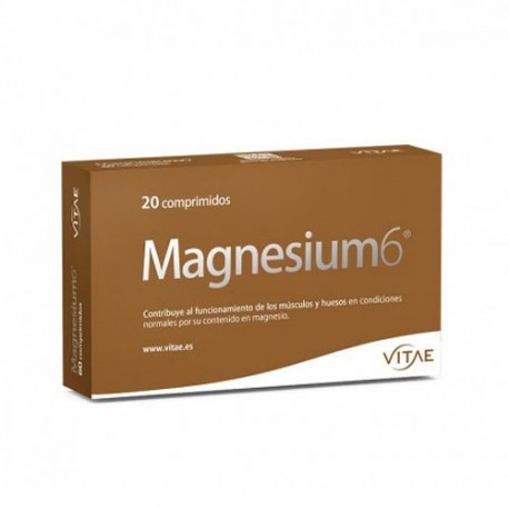 Complemento alimenticio con 6 sales diferentes de magnesio, taurina y vitamina B6.Vitae Magnesium6 20 Comprimidos es un complemento alimenticio de elevada biodisponibilidad, a base de 6 sales de magnesio combinadas con vitamina B6 y taurina La presencia de vitamina B6 ayuda en la absorción del magnesio, y la taurina es un ahorrador de magnesio a nivel renal, minimizando las pérdidas del mineral. Magnesium6 ayuda al correcto aporte de magnesio y favorece el cuidado y bienestar músculo-esquelético y articular. La acción de la taurina es importante ya que sobretodo en épocas de estrés se pierden gran cantidades de magnesio por la orina.