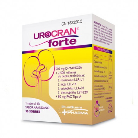 Mantener protegidas las vías urinarias es importante para evitar infecciones de orina y cistitis. Para esta labor, Urocran Forte contiene un combinado de D-manosa, arándano rojo y probióticos. Esta fórmula protege las vías urinarias así como el sistema excretor y el inmunitario. Así, mantendrás la flora bacteriana de tu organismo funcionando perfectamente al tiempo que combates las posibles bacterias que quieran dañarlo.