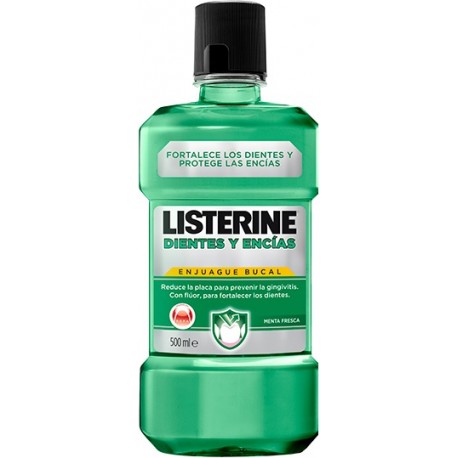 Listerine Dientes y Encías Menta 500ml se trata de una solución eficaz en colutorio dedicado a completar el cepillado garantizando la completa eliminación de las bacterias y gérmenes, es decir, el colutorio puede alcanzar aquellos lugares que puedan quedar fuera de la limpieza del cepillado. Combina propiedades antisépticas para combatir los gérmenes con el flúor para prevenir la aparición de la placa bacteriana y que no se produzca la temida gingivitis.