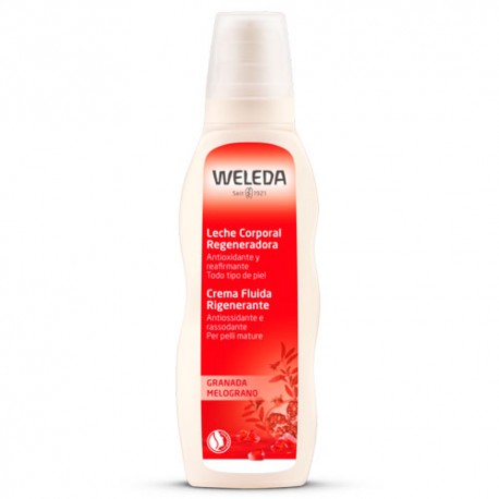 Esta leche corporal está indicada para recuperar el equilibrio del manto hidrolipídico de la piel y devolverle firmeza a la piel.Weleda Leche Corporal Regeneradora Granada 200 ml está indicada para el cuidado corporal. Esta leche se compone de aceite de granada biológico, aceite de hueso de albaricoque y manteca de karité, tres ingredientes que contribuyen por sus vitaminas, proteínas y minerales a restaurar la salud de la piel, dejándola más firme y radiante. Al ser una crema rica en antioxidantes, estimula la renovación celular a la vez que reafirma y aporta elasticidad.