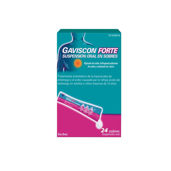 Gaviscon Forte en suspension oral es un medicamento para aliviar los síntomas consecuencia de la aparición del reflujo gastroesofágico como la hiperacidez estomacal y el ardor.Gaviscon Forte 24 Sobres 10 ml contiene agentes para prevenir los síntomas del reflujo gastroesofágico y la hiperacidez estomacal. Este medicamento contiene tres principios activos: el alginato de sodio, el hidrógenocarbonato de sodio y el carbonato de calcio. Estos crean una barrera protectora en el estómago que detiene la aparición del reflujo gástrico, a la vez que alivian el ardor en la boca del estómago y neutralizan la cantidad de ácidos del mismo.