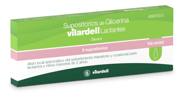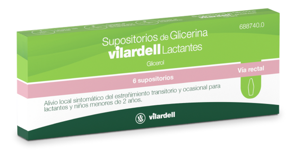 Medicamento con propiedades laxantes administrada por vía rectal.Podemos encontrar este medicamento en un formato de 6 supositorios, como es el caso, o bien con 15 supositorios de la misma composición. Supositorios Glicerina Vilardell Lactantes se trata de un medicamento elaborado con glicerol, un poderoso principio activo que actúa como laxante. Viene en un formato de supositorio que introduciremos fácilmente por la vía rectal para conseguir que el glicerol ablande las heces y que acompañada de una leve irritación local se estimulen los movimientos del intestino, con el que se aliviarán los síntomas del estreñimiento transitorio en niños y lactantes. Si presencias la aparición en tu pequeño sangre en las heces, escoriación, dolor o que no mejora, debes interrumpir el tratamiento y consultar a su especialista.